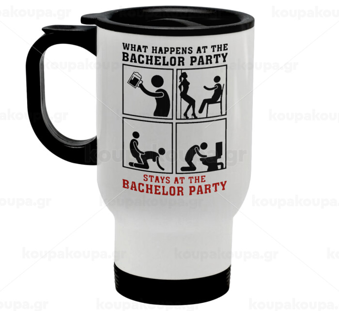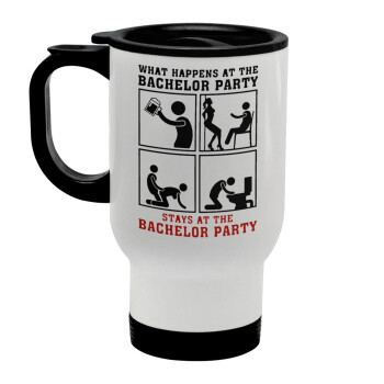 What happens at the bachelor party, stays at the bachelor party!, Stainless steel travel mug with lid, double wall white 450ml