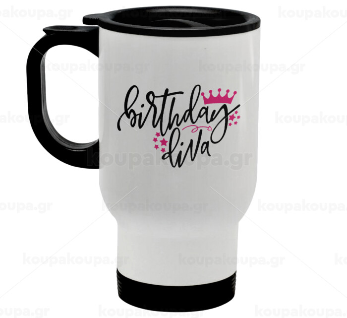 Birthday Diva queen, Stainless steel travel mug with lid, double wall white 450ml