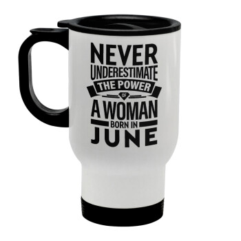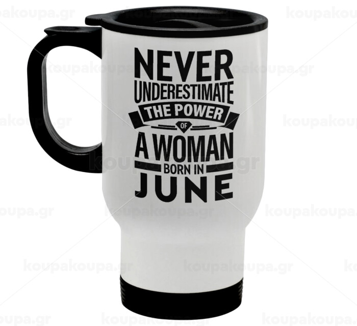 Never Underestimate the poer of a Woman born in..., Stainless steel travel mug with lid, double wall white 450ml