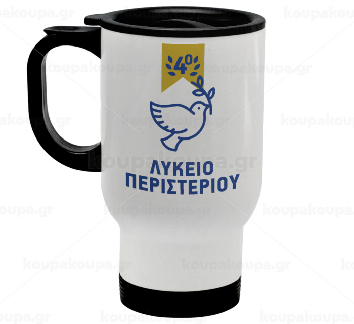 Έμβλημα Σχολικό μπλε/χρυσό περιστέρι, Stainless steel travel mug with lid, double wall white 450ml