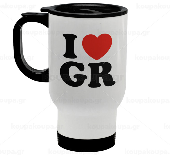 I Love GR, Stainless steel travel mug with lid, double wall white 450ml