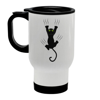 cat grabbing, Stainless steel travel mug with lid, double wall white 450ml