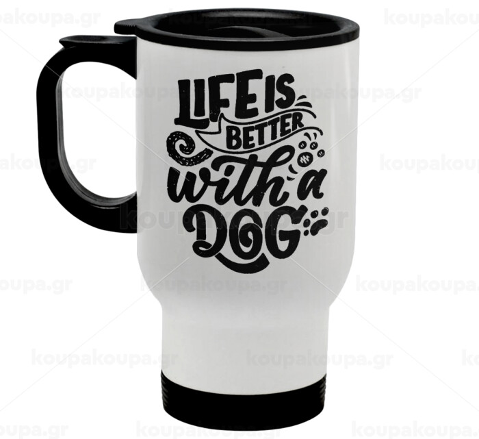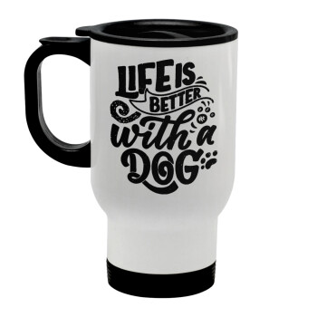 Life is better with a DOG, Stainless steel travel mug with lid, double wall white 450ml