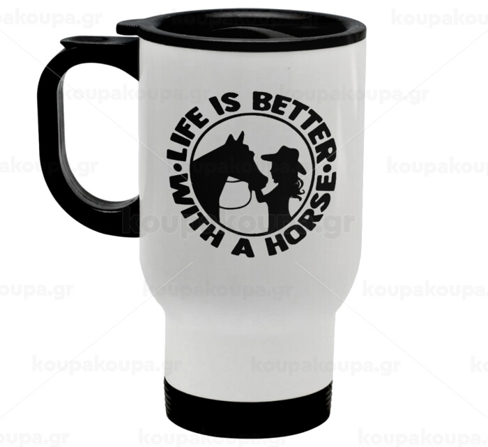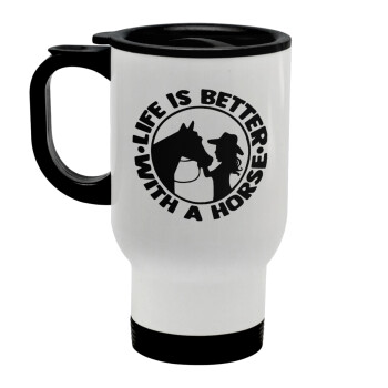 Life is Better with a Horse, Stainless steel travel mug with lid, double wall white 450ml