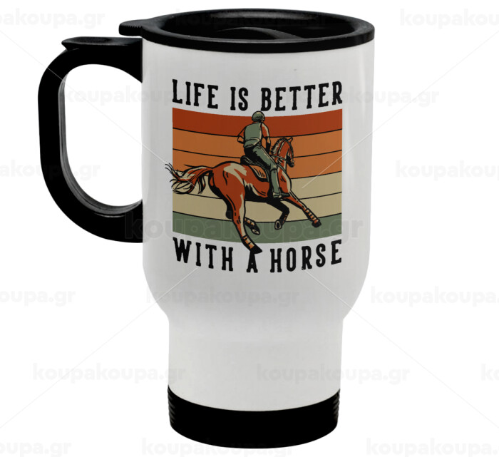 Life is Better with a Horse, Stainless steel travel mug with lid, double wall white 450ml