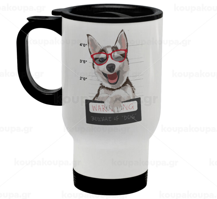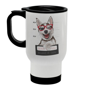 Warning, beware of Dog, Stainless steel travel mug with lid, double wall white 450ml