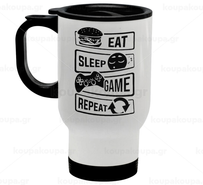 Eat Sleep Game Repeat, Stainless steel travel mug with lid, double wall white 450ml