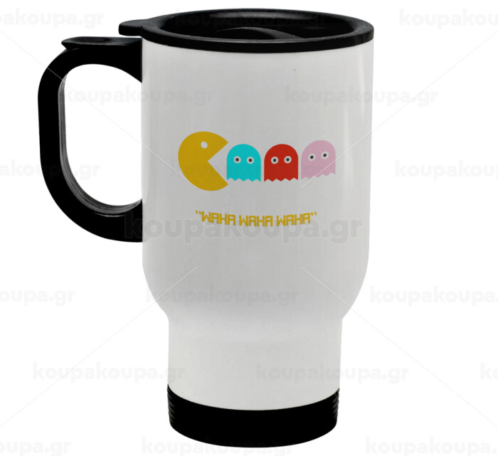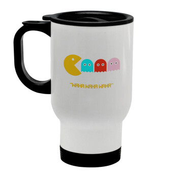 Pacman waka waka waka, Stainless steel travel mug with lid, double wall white 450ml