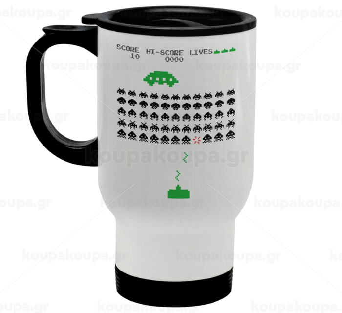 Space invaders, Stainless steel travel mug with lid, double wall white 450ml