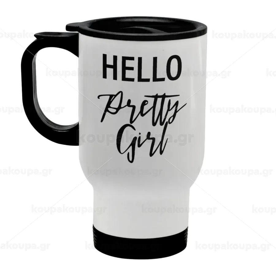 Hello pretty girl, Stainless steel travel mug with lid, double wall white 450ml