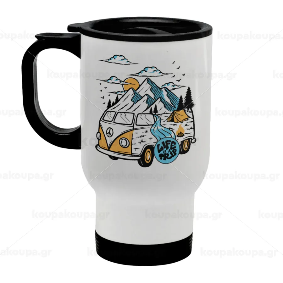 Life is a trip, Stainless steel travel mug with lid, double wall white 450ml