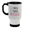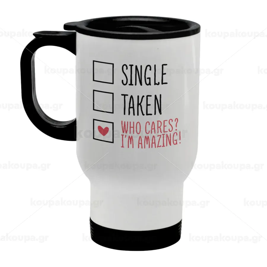 Single, Taken, Who cares i'm amazing, Stainless steel travel mug with lid, double wall white 450ml