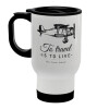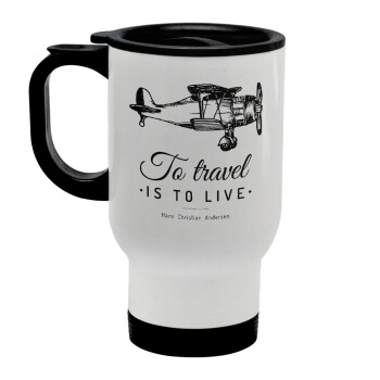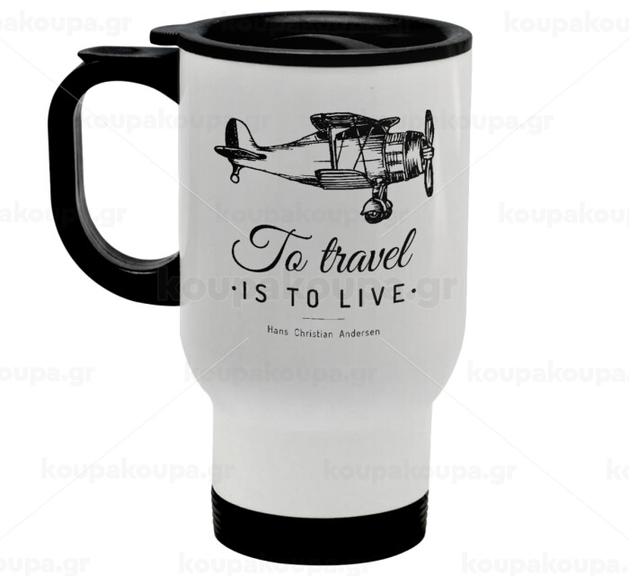 To travel is to live, Stainless steel travel mug with lid, double wall white 450ml