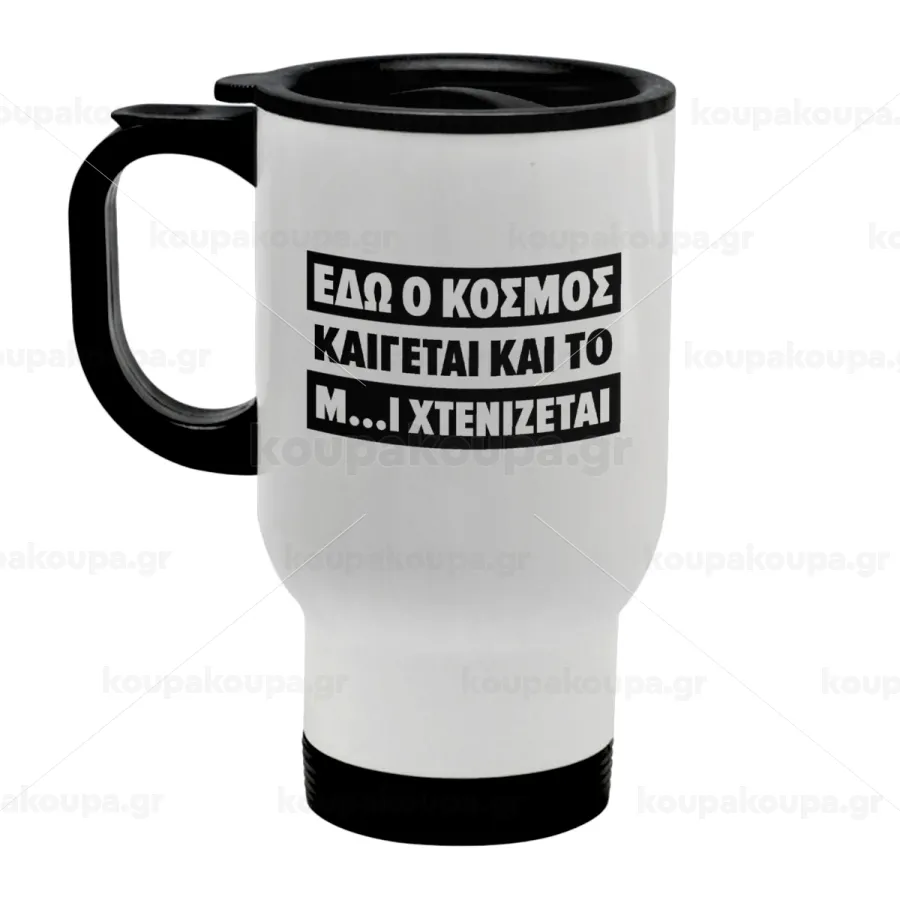 Εδώ ο κόσμος καίγεται και το Μ....Ι χτενίζεται, Stainless steel travel mug with lid, double wall white 450ml