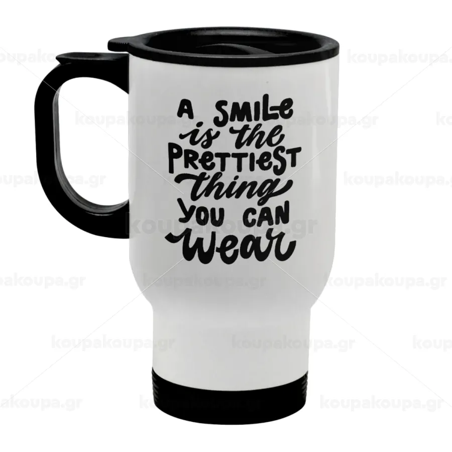 A smile is the prettiest thing you can wear, Stainless steel travel mug with lid, double wall white 450ml