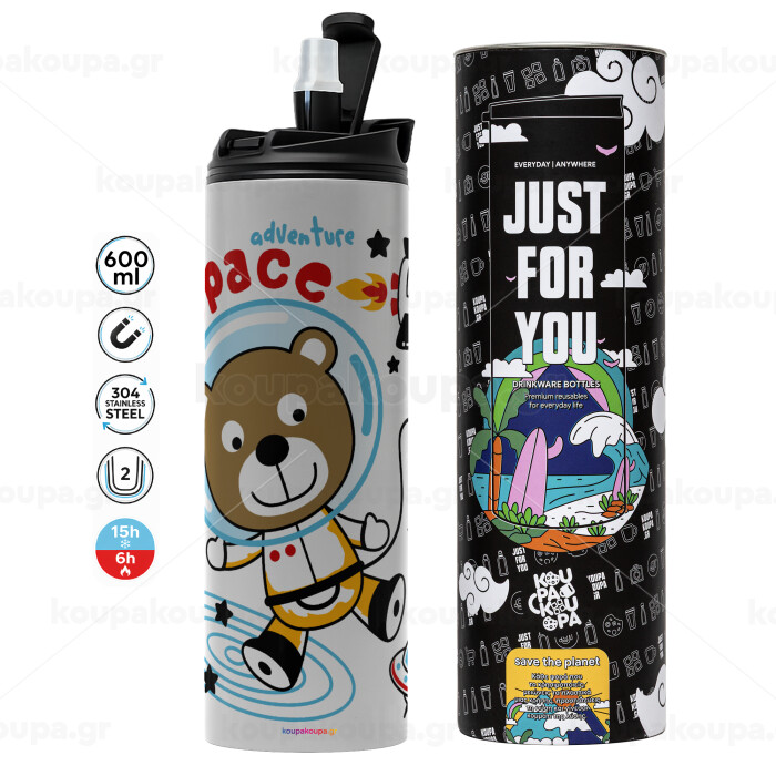 Eco friendly 600ml thermal cup with a metallic reusable straw. Enjoy your favorite beverage at any moment in this unique eco-friendly thermos. It maintains the temperature for several hours and is made from stainless steel. Suitable for both hot and cold beverages. It comes with a cleaning brush for the straw.