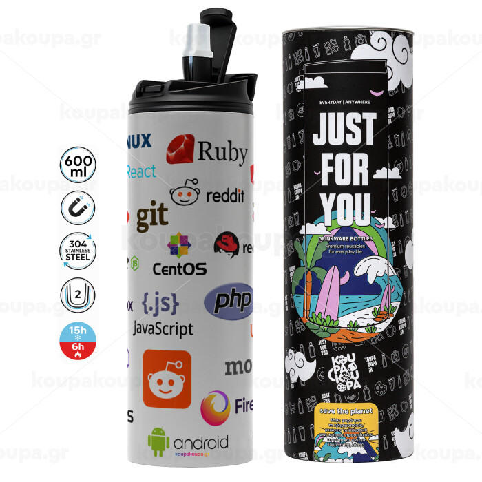 Eco friendly 600ml thermal cup with a metallic reusable straw. Enjoy your favorite beverage at any moment in this unique eco-friendly thermos. It maintains the temperature for several hours and is made from stainless steel. Suitable for both hot and cold beverages. It comes with a cleaning brush for the straw.
