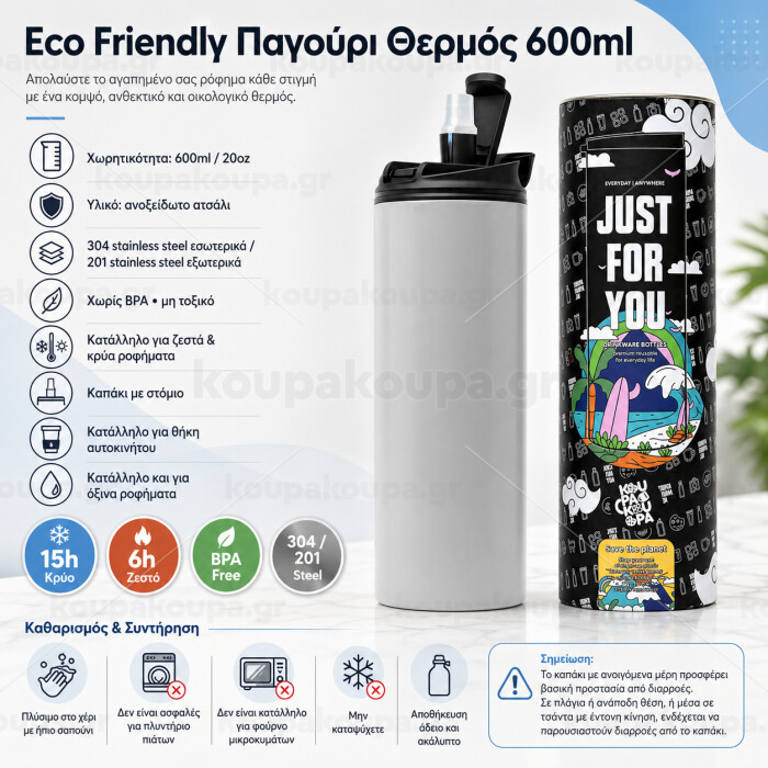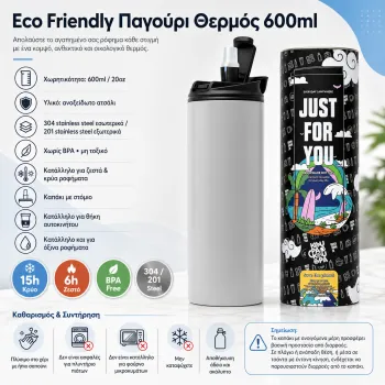 Eco friendly παγούρι θερμός 600ml. Απολαύστε το αγαπημένο σας ρόφημα κάθε στιγμή με αυτό το κομψό και οικολογικό θερμός, κατασκευασμένο από ανοξείδωτο ατσάλι. Διατηρεί τη θερμοκρασία για αρκετές ώρες και είναι κατάλληλο για ζεστά και κρύα ροφήματα.