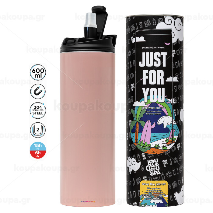 Eco friendly 600ml thermal cup with a metallic reusable straw. Enjoy your favorite beverage at any moment in this unique eco-friendly thermos. It maintains the temperature for several hours and is made from stainless steel. Suitable for both hot and cold beverages. It comes with a cleaning brush for the straw.