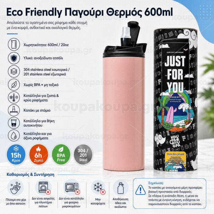Eco friendly παγούρι θερμός 600ml. Απολαύστε το αγαπημένο σας ρόφημα κάθε στιγμή με αυτό το κομψό και οικολογικό θερμός, κατασκευασμένο από ανοξείδωτο ατσάλι. Διατηρεί τη θερμοκρασία για αρκετές ώρες και είναι κατάλληλο για ζεστά και κρύα ροφήματα.