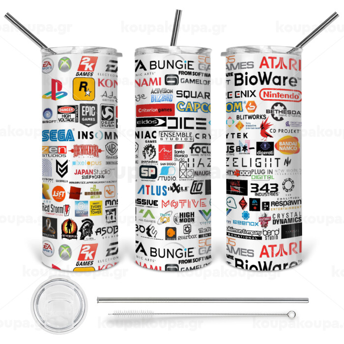 Video Game Studio Logos, Tumbler stainless steel 600ml, with metal straw & cleaning brush
