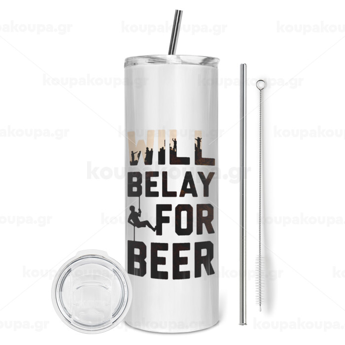 Will Belay For Beer, Tumbler stainless steel 600ml, with metal straw & cleaning brush