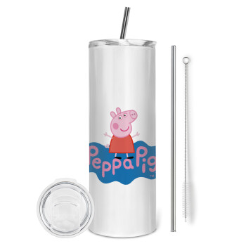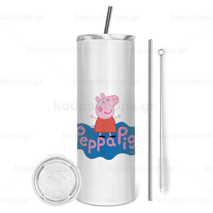 Πέππα το γουρουνάκι μπλε με όνομα, Tumbler stainless steel 600ml, with metal straw & cleaning brush