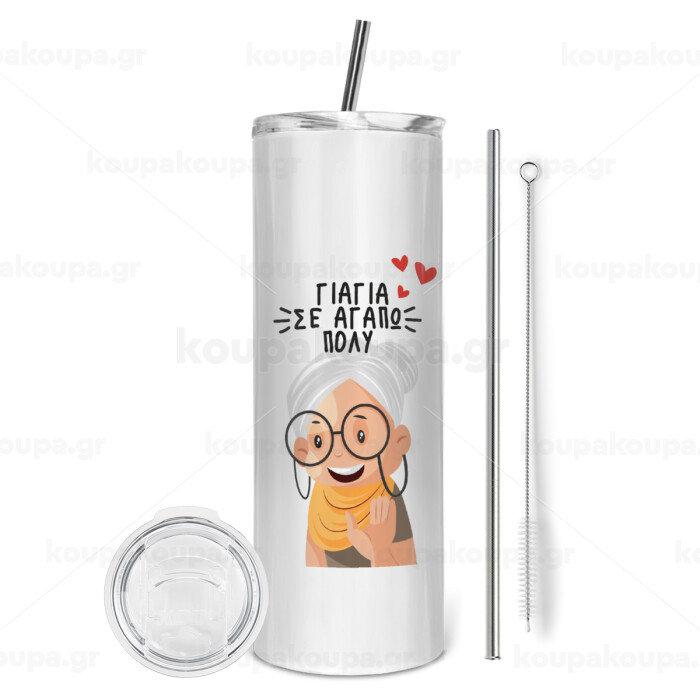 Γιαγιά σε αγαπώ πολύ!, Tumbler stainless steel 600ml, with metal straw & cleaning brush