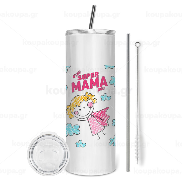 Στην SUPER μαμά μου, comic, Tumbler stainless steel 600ml, with metal straw & cleaning brush
