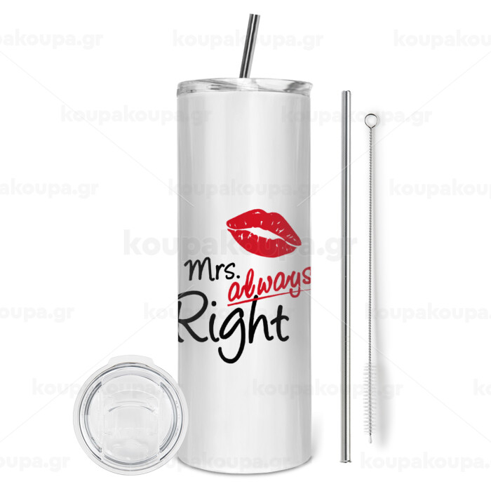 Mrs always right kiss, Tumbler stainless steel 600ml, with metal straw & cleaning brush