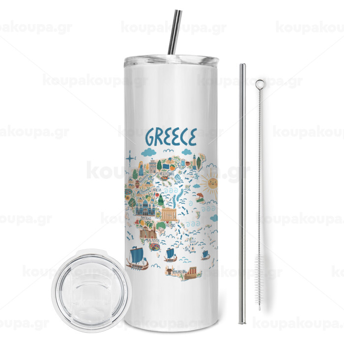 Greek map, Tumbler stainless steel 600ml, with metal straw & cleaning brush