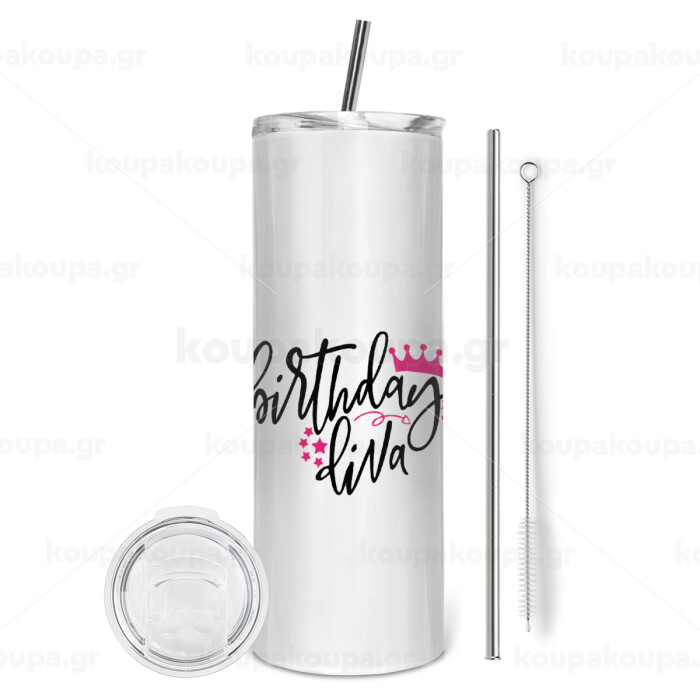Birthday Diva queen, Tumbler stainless steel 600ml, with metal straw & cleaning brush