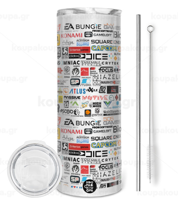 Video Game Studio Logos, Tumbler stainless steel 600ml, with metal straw & cleaning brush
