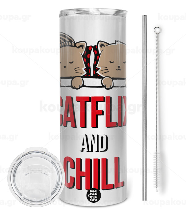 Catflix and Chill, Tumbler stainless steel 600ml, with metal straw & cleaning brush
