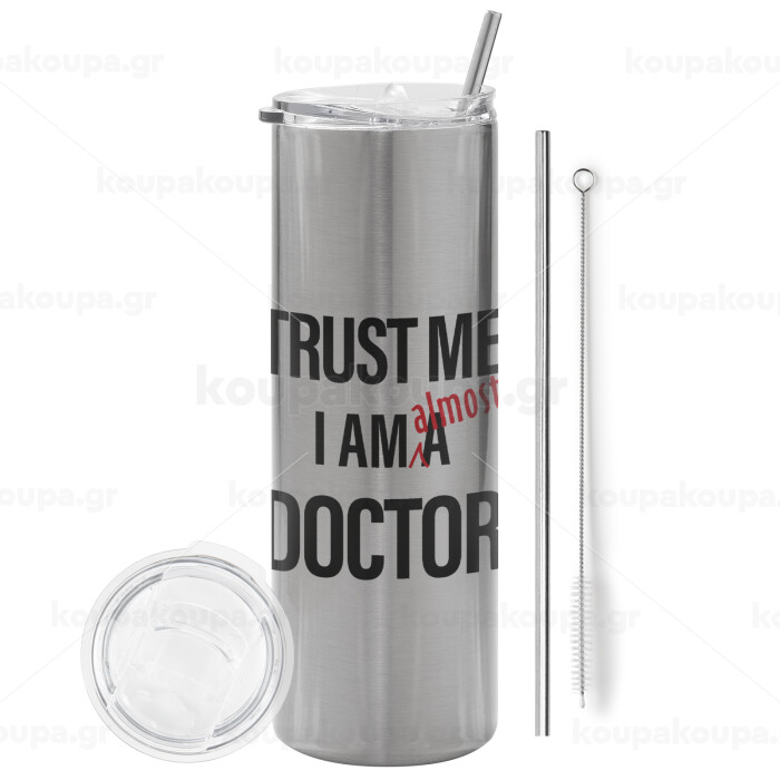 Trust me, i am (almost) Doctor, Tumbler stainless steel Silver 600ml, with metal straw & cleaning brush