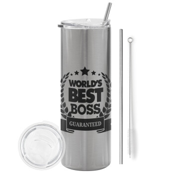 World's best boss stars, Tumbler stainless steel Silver 600ml, with metal straw & cleaning brush