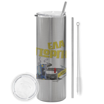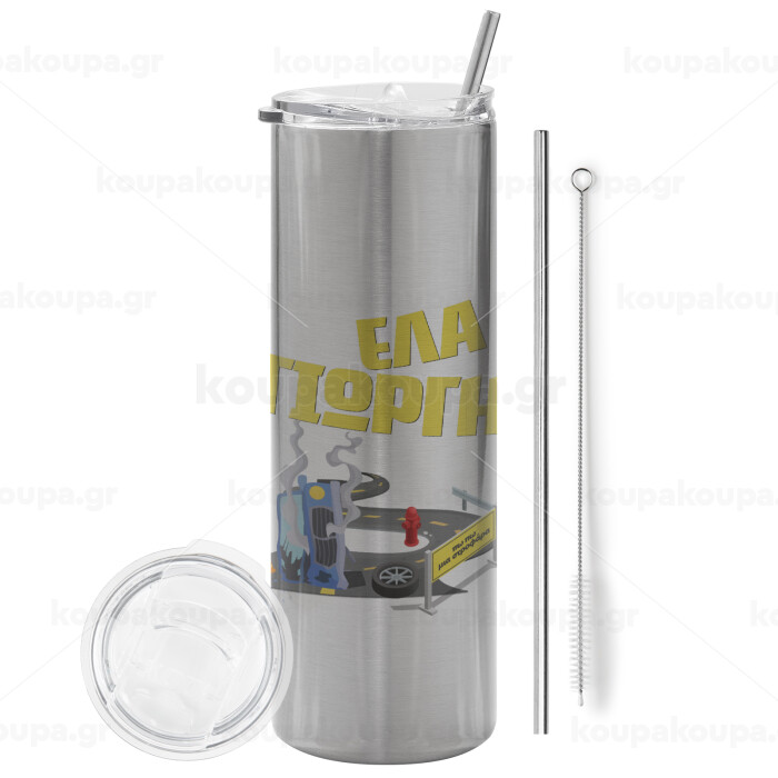 Έλα Γιώργη, πω πω μια στροφάρα, Tumbler stainless steel Silver 600ml, with metal straw & cleaning brush