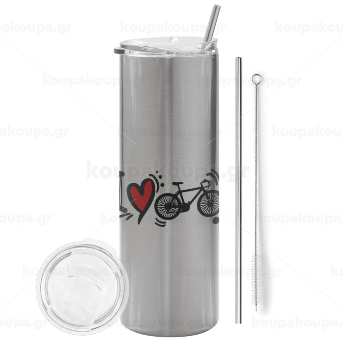 I love my bike, Tumbler stainless steel Silver 600ml, with metal straw & cleaning brush