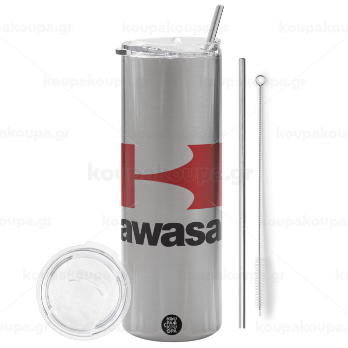 Kawasaki, Tumbler stainless steel Silver 600ml, with metal straw & cleaning brush