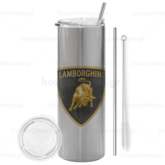 Lamborghini, Tumbler stainless steel Silver 600ml, with metal straw & cleaning brush