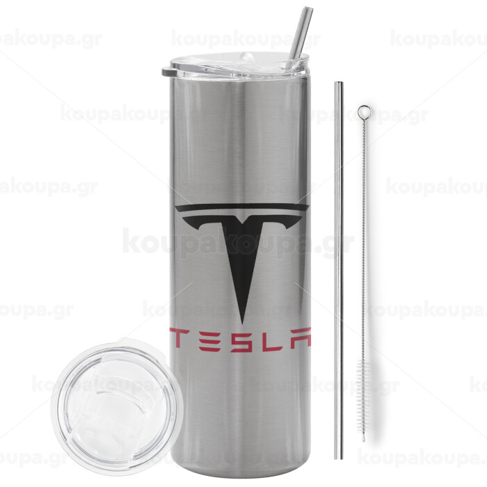 Tesla motors, Tumbler stainless steel Silver 600ml, with metal straw & cleaning brush
