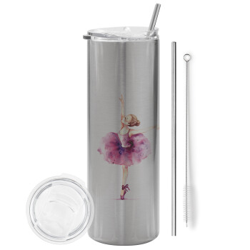 Ballerina watercolor, Tumbler stainless steel Silver 600ml, with metal straw & cleaning brush