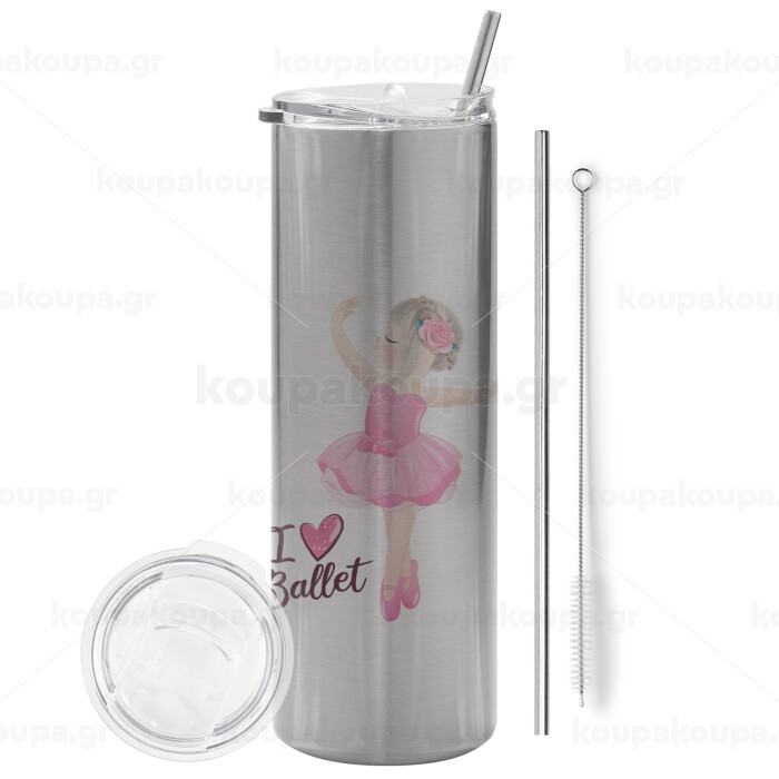 I Love Ballet, Tumbler stainless steel Silver 600ml, with metal straw & cleaning brush