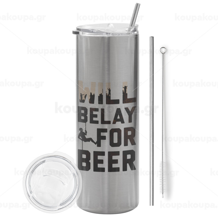 Will Belay For Beer, Tumbler stainless steel Silver 600ml, with metal straw & cleaning brush