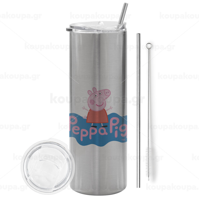 Πέππα το γουρουνάκι μπλε με όνομα, Tumbler stainless steel Silver 600ml, with metal straw & cleaning brush