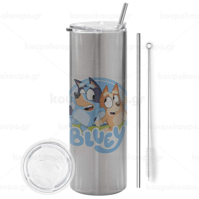 Μπλε, Tumbler stainless steel Silver 600ml, with metal straw & cleaning brush