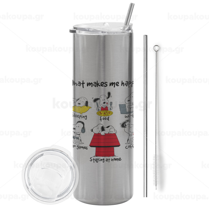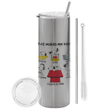 Snoopy what makes my happy, Tumbler stainless steel Silver 600ml, with metal straw & cleaning brush
