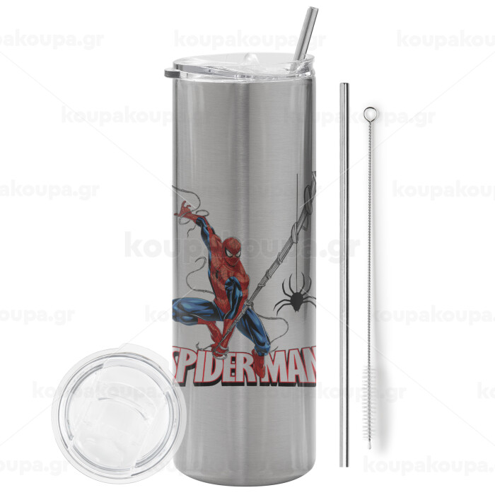 Spiderman fly, Tumbler stainless steel Silver 600ml, with metal straw & cleaning brush