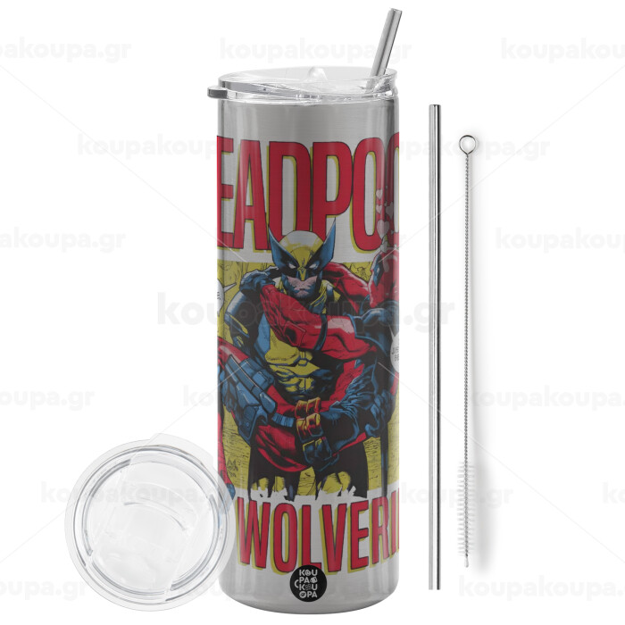 Superhero Deadpool Wolverine, Tumbler stainless steel Silver 600ml, with metal straw & cleaning brush