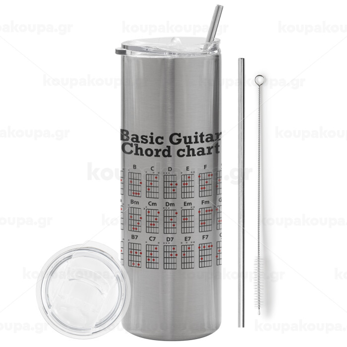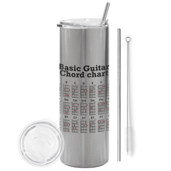 Guitar tabs, Tumbler stainless steel Silver 600ml, with metal straw & cleaning brush